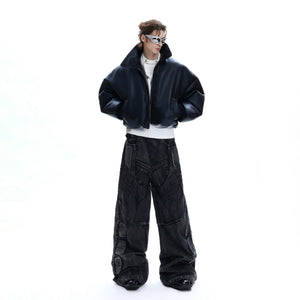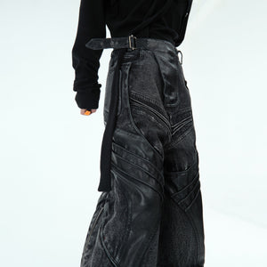 Distressed Black Jeans - Deconstructed PU Leather Panels