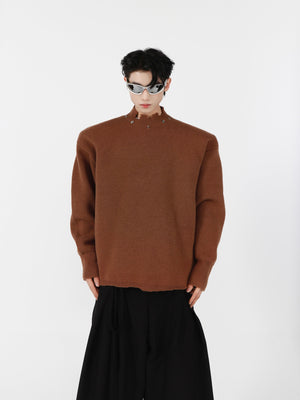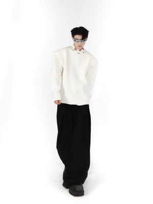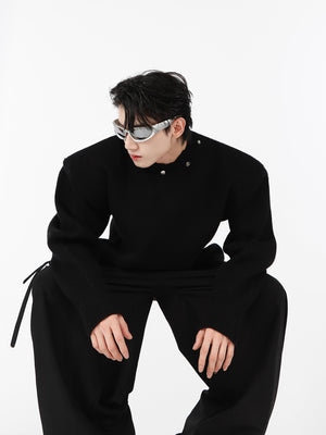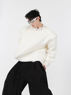 Distressed Shoulder-Pad Sweater with Metal Accents - Streetwear Top