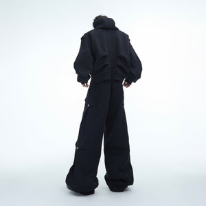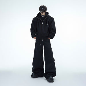 This set masterfully blends motorcycle aesthetics with urban core elements. The hoodie features dimensional pleating at sleeves and shoulders with structured tailoring that breaks from conventional sweatshirt designs. Matching wide-leg pants complete the look with signature side seam pleats and multi-pocket detailing for ultimate street credibility.