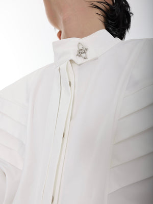 Elevate your urban wardrobe with this statement-making pleated shirt that blends edgy sophistication with street-ready style. The hidden metal button placket and structured stand collar with branded logo buttons create a fresh take on classic shirt design.