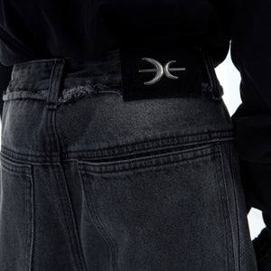 Distressed grey straight-leg jeans with raw hem and water ripple fringe detailing, perfect for edgy streetwear looks