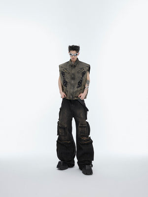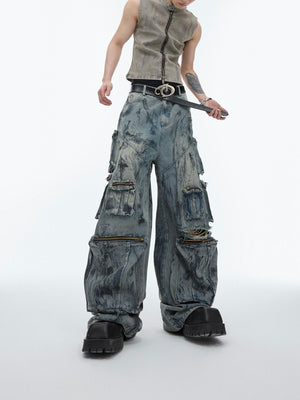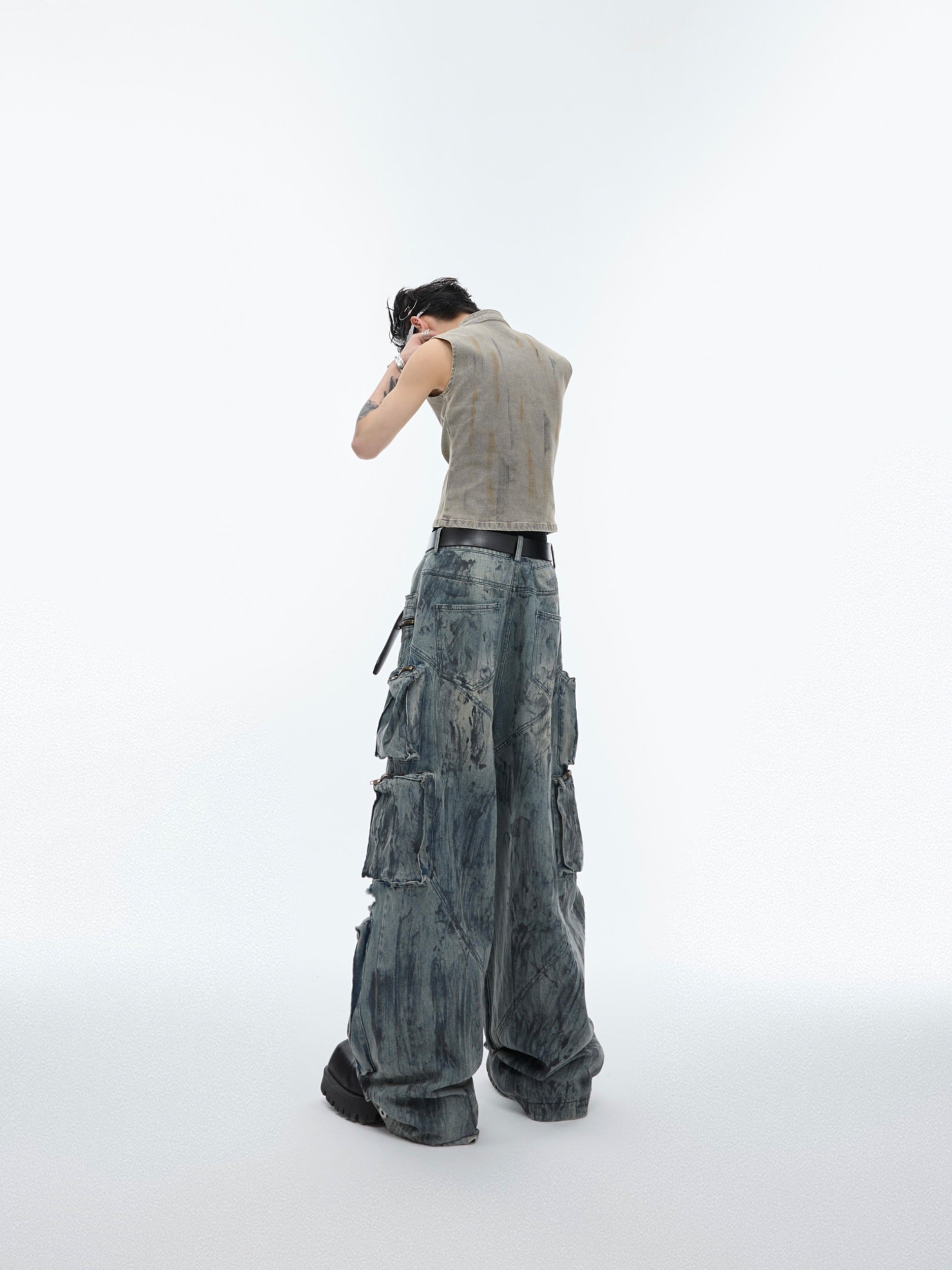 Distressed Straight-Leg Jeans with Hand-Painted Details & Multi-Pockets