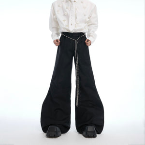 Elevate your urban wardrobe with these deconstructed micro-flare pants featuring edgy metal chain detailing. A perfect fusion of high fashion and streetwear attitude.