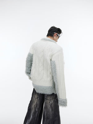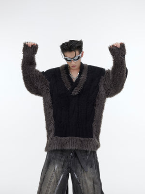 Elevate your street style with this eye-catching V-neck sweater that blends plush texture with contemporary design. The bold colorblock detailing makes this piece an instant standout in any urban fashion lineup.