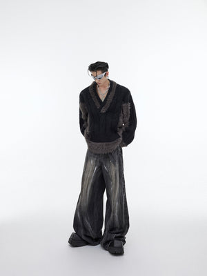 Oversized V-Neck Knit Sweater - Color-Block Fleece Trim Streetwear