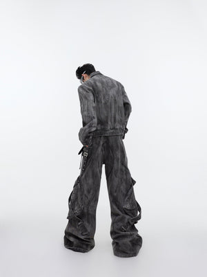 Vintage Distressed Denim Set - Zip Jacket & Cargo Pants